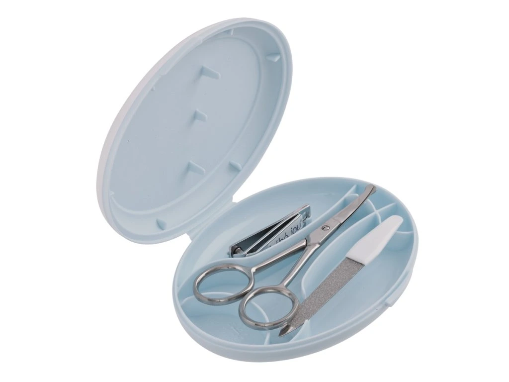 A Bebe-jou Baba manikűr szett egy 3 darabos rozsdamentes acél kozmetikai készlet praktikus, kompakt tokban, mely ideális a baba körmeinek ápolására.