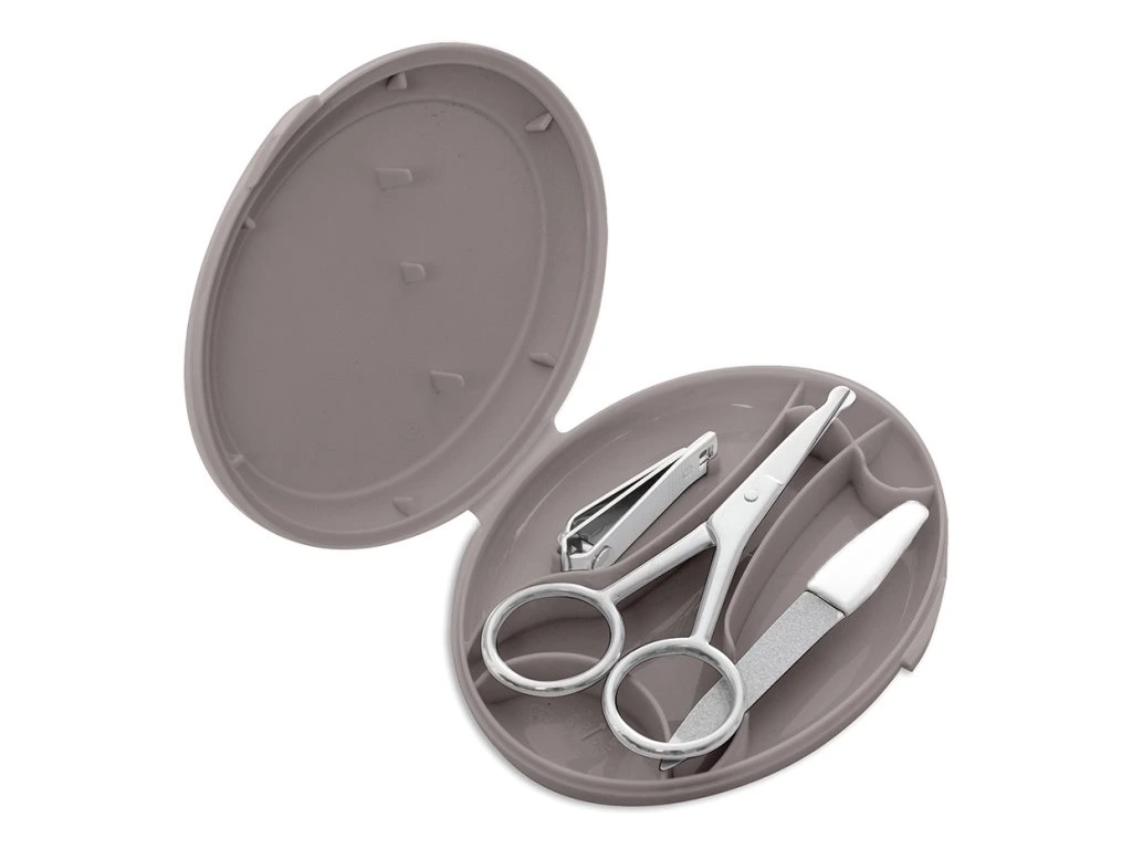 Manikűr:tartalmaz egy lekerekített végű ollót, körömreszelőt és kis körömcsipeszt is. Minden rozsdamentes acélból készült. Egyes használat előtt mindent alaposan tisztítson le, újszülött baba esetén deizinfikálja alkoholos oldattal.
