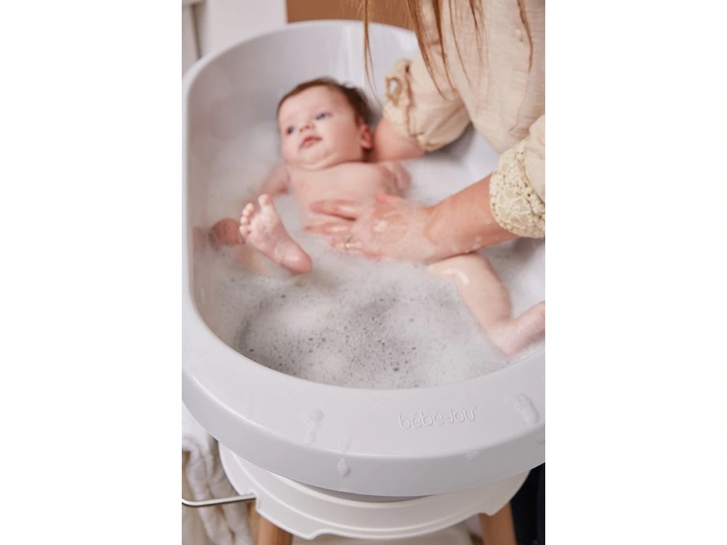 A baba fürdetése egy mindennapi rituális. Az állványon lévő fürdőkáddal lehetőség nyílik a gyerekjátékokkal való játékra és a babat bárhol lehet furdetni . Az állvánnyal ellátott kád ezután addig marad a szobában , ameddig csak akarja, és a dizajnja hatással lesz a helyiségben lévő kornyezetre . A Bébé-Jou Sense fürdőkád dizájnállványa ezt a koncepciót demonstrálja, a műanyag és a bükkfa lábak észrevehető kombinációjával.
