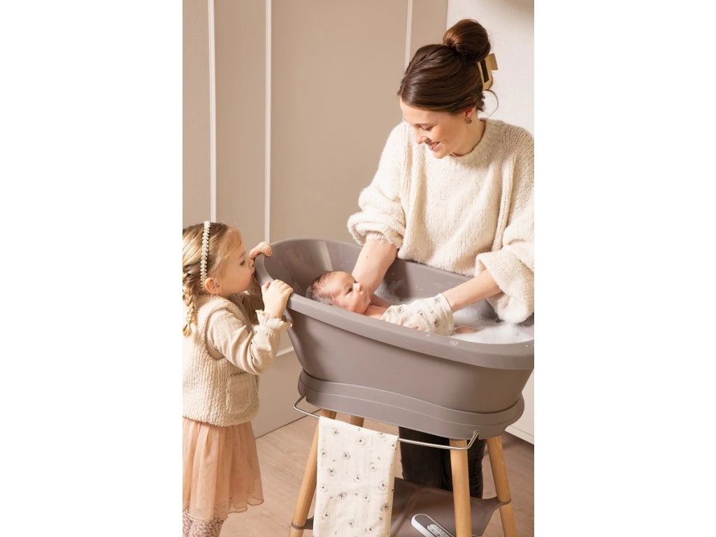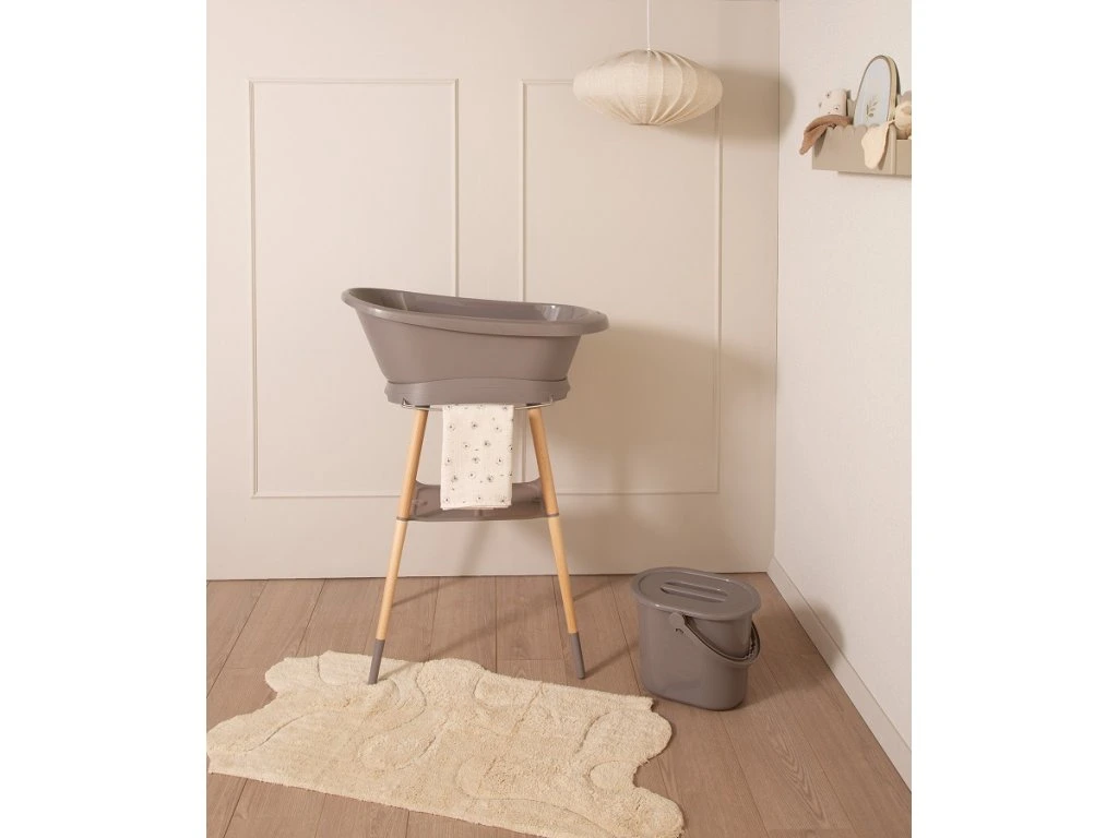 A baba fürdetése egy mindennapi rituális. Az állványon lévő fürdőkáddal lehetőség nyílik a gyerekjátékokkal való játékra és a babat bárhol lehet furdetni . Az állvánnyal ellátott kád ezután addig marad a szobában, ameddig csak akarja, és a dizajnja hatással lesz a helyiségben lévő kornyezetre . A Bébé-Jou Sense fürdőkád dizájnállványa ezt a koncepciót demonstrálja, a műanyag és a bükkfa lábak észrevehető kombinációjával.