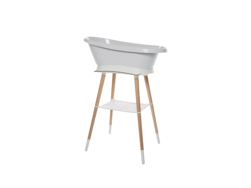 A baba fürdetése egy mindennapi rituális. Az állványon lévő fürdőkáddal lehetőség nyílik a gyerekjátékokkal való játékra és a babat bárhol lehet furdetni . Az állvánnyal ellátott kád ezután addig marad a szobában, ameddig csak akarja, és a dizajnja hatással lesz a helyiségben lévő kornyezetre . A Bébé-Jou Sense fürdőkád dizájnállványa ezt a koncepciót demonstrálja, a műanyag és a bükkfa lábak észrevehető kombinációjával.