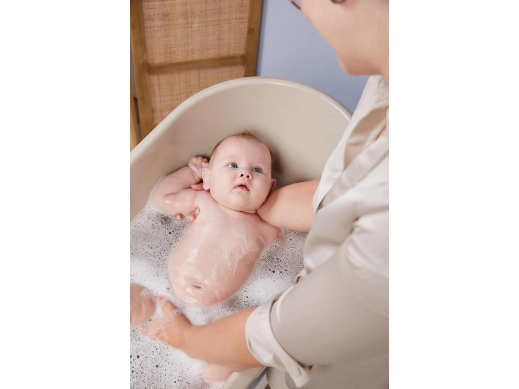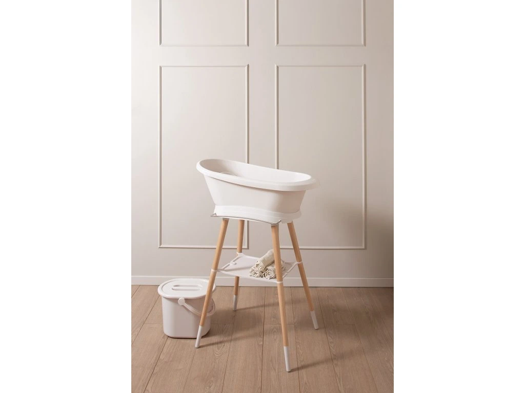 A baba fürdetése egy mindennapi rituális. Az állványon lévő fürdőkáddal lehetőség nyílik a gyerekjátékokkal való játékra és a babat bárhol lehet furdetni . Az állvánnyal ellátott kád ezután addig marad a szobában, ameddig csak akarja, és a dizajnja hatással lesz a helyiségben lévő kornyezetre . A Bébé-Jou Sense fürdőkád dizájnállványa ezt a koncepciót demonstrálja, a műanyag és a bükkfa lábak észrevehető kombinációjával.