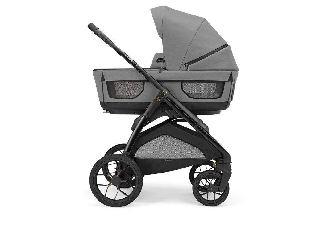Az új Aptica XT kombinált babakocsi adaptív felfüggesztéssel, mózeskosárral 5 szellőző ablakkal és új, 1,5 kg-mal könnyebb alvázzal, nagy kerekekkel.