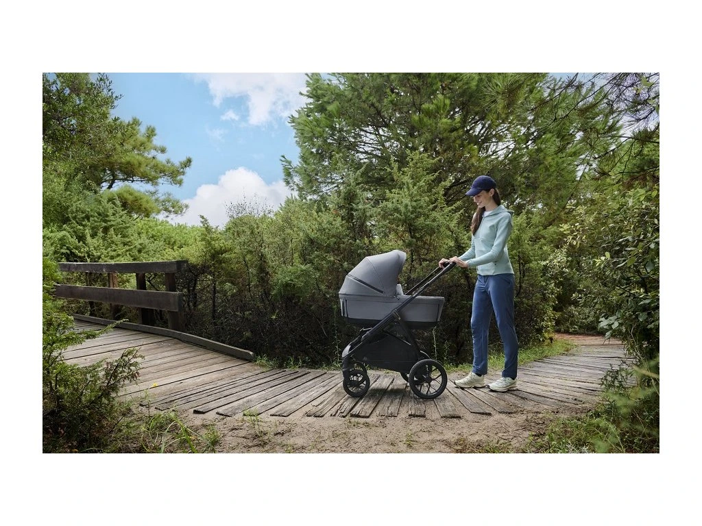 Az új Aptica XT kombinált babakocsi adaptív felfüggesztéssel, mózeskosárral 5 szellőző ablakkal és új, 1,5 kg-mal könnyebb alvázzal, nagy kerekekkel és a DARWIN RECLINE dönthető hordozóval.