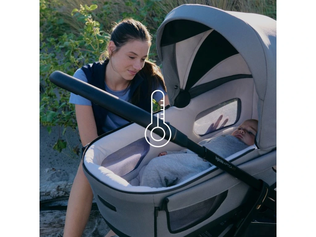 Az APTICA XT babakocsi adaptív felfüggesztéssel, mózeskosárral 5 szellőző ablakkal és új 1,5 kg-mal könnyebb alvázzal, nagy kerekekkel, és a DARWIN hordozóval, amely az ADAC teszten 2,0-s értékelést kapott.