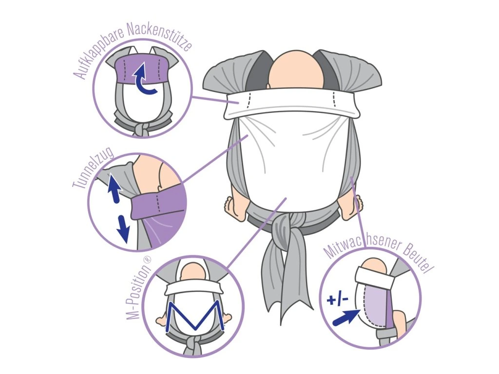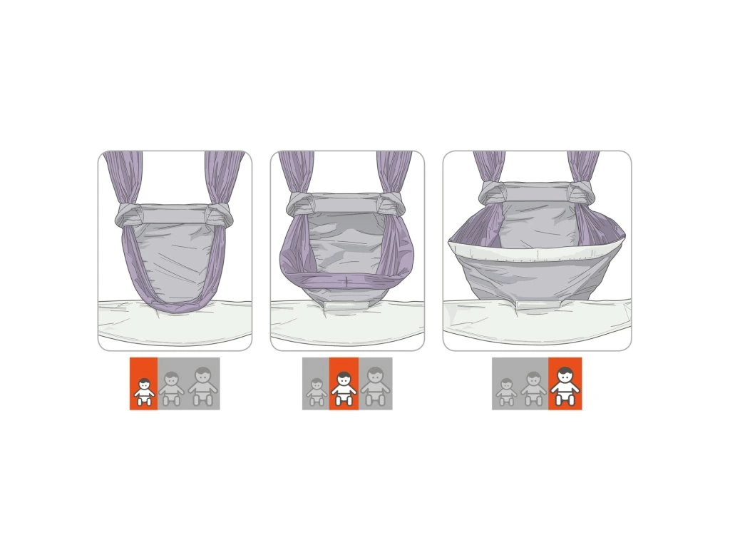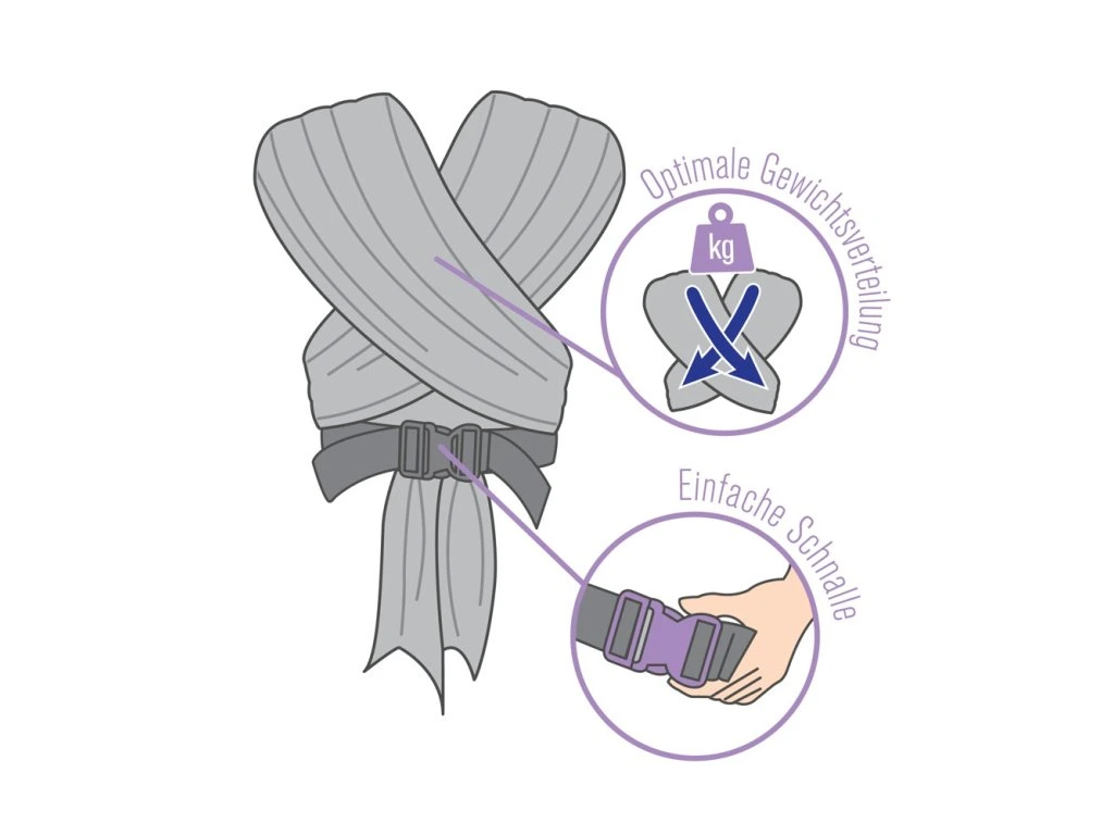 Intelligens tervezés: Az egyszerű kötési módszernek köszönhetően a méret gyorsan és könnyen beállítható. A állítható pántokkal rendelkező hordozóinkhoz képest ez hatalmas előny.
